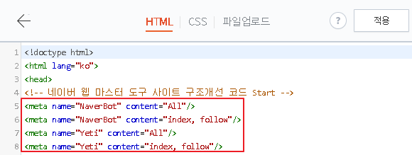 HTML 편집에서 <meta> 추가