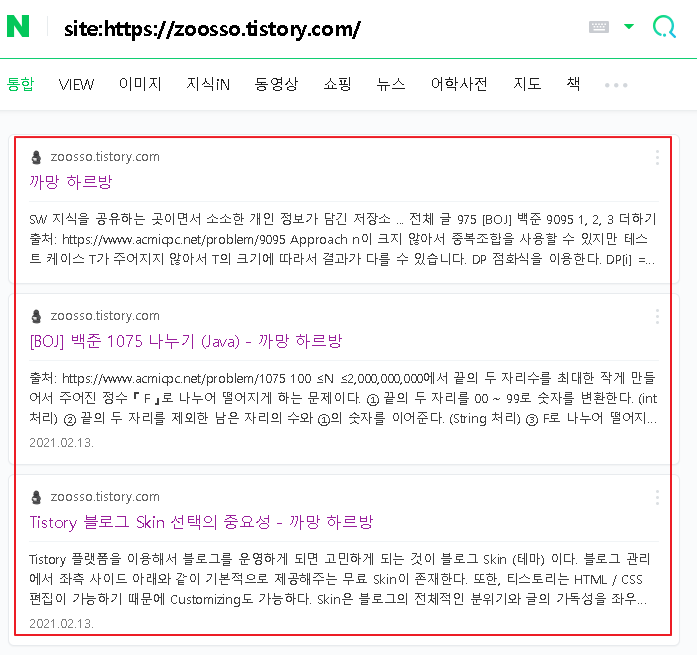 여전히 네이버 검색되는 사이트는 블로그 홈(Home) 한개 였으며.