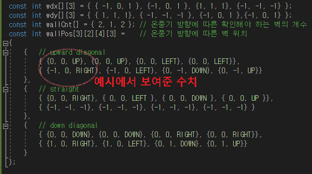 이때 진행방향에 따라서 확인해야하는 벽의 위치와 개수가 다르다.