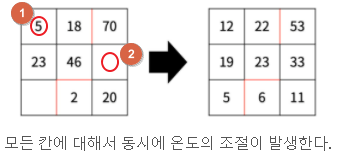높은 칸이 온도 감소, 낮은 칸이 온도 증가할 수 있도록 처리