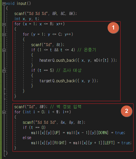 ① 온풍기와 조사해야 하는 칸의 정보