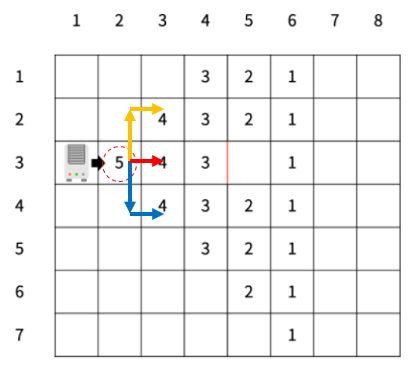 대각선 방향은 2개의 벽을 통과해야 하며, 직선 방향은 1개의 벽을 통과해야 한다.