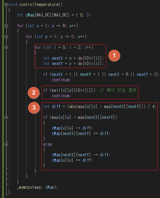 • 온도가 1 이상인 칸의 온도가 1씩 감소한다.