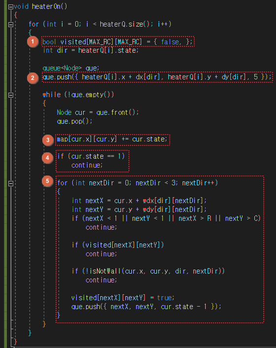 que.push({ heaterQ[i].x + dx[dir], heaterQ[i].y + dy[dir], 5 });