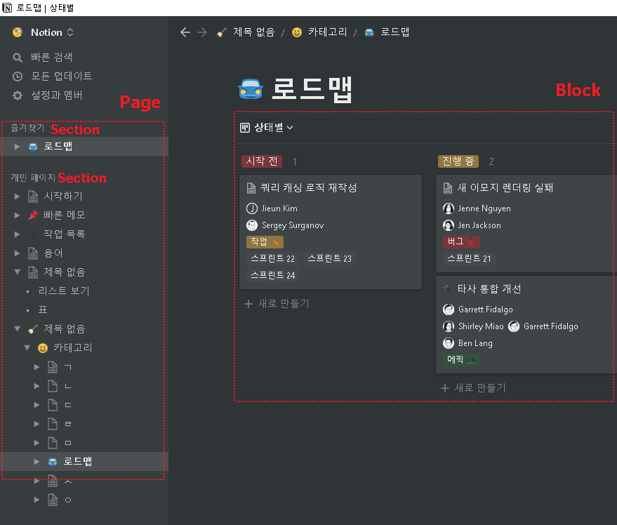 Notion 작업공간은 섹션(Section) / 페이지(Page) / 블록(Block) 으로 구성된다.