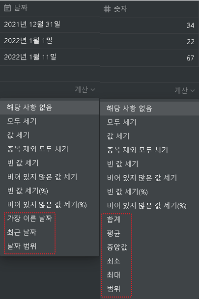 또한 [계산] 항목은 텍스트 / 숫자 / 날짜 속성에 따라 차이가 있다.