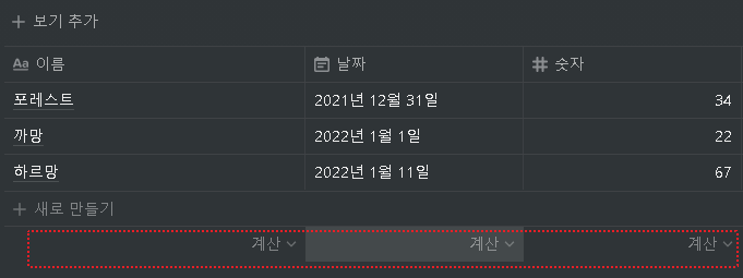 노션의 데이터베이스 하단에는 요약(계산) 기능이 있다.