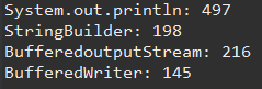System.out.println( "BufferedoutputStream: " + (bufferedoutputtime - stringbuildertime) );