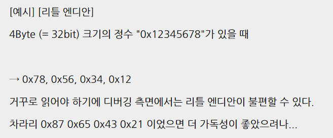 낮은 주소에 하위 비트(LSB : Least Significant Byte)를 저장하는 방식.