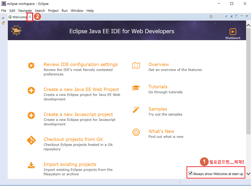 처음 실행되면 이클립스 "Welcome" 화면이 보여집니다.