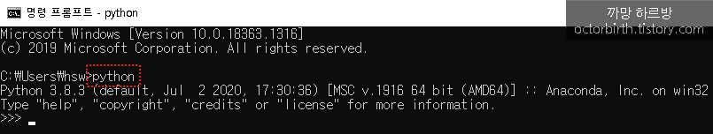 "python" 입력 후 Enter 하면 아래와 같이 결과가 나온다.