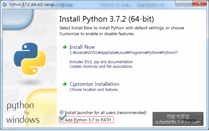 설치할 때, "Add Python" 체크해야 환경 변수가 제대로 잡힌다.
