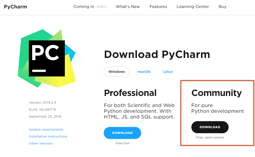 https://www.jetbrains.com/ko-kr/pycharm/ 에서 Community 다운