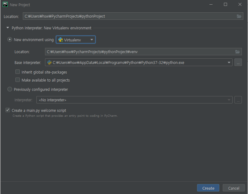 파이참을 실행하면 "New Project"