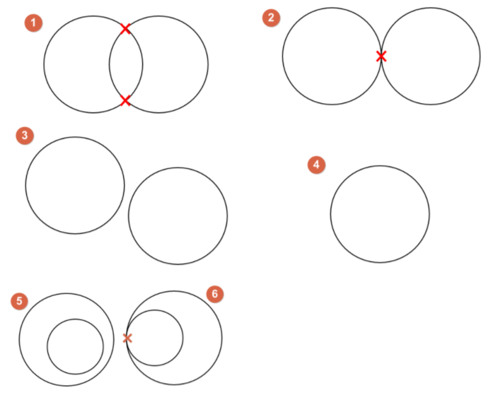 두 원의 교점은 크게 6가지로 분류할 수 있다.