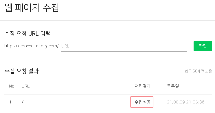2일 뒤에 들어가서 상태를 확인해보니 [수집성공]으로 상태가 변경되어 있었다.