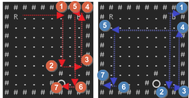 - 빨간 구슬과 파란 구슬은 동시에 같은 칸에 있을 수 없습니다.