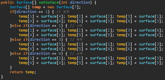 - 동쪽(→)으로 이동했을 때, Index [4]에 있던 값을 윗면[1] / Index [3]을 아랫면[6]으로 처리
