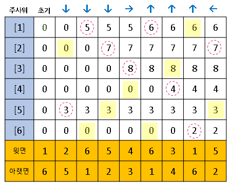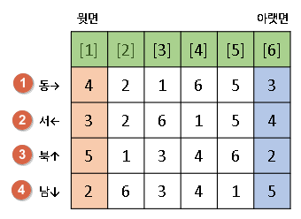 이때, 이동할 때마다 주사위의 윗면, 아랫면의 상태는 다음과 같습니다.