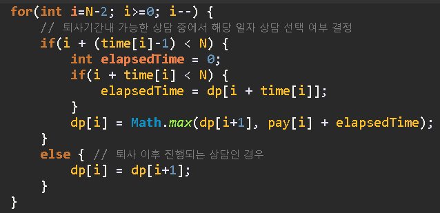 dp[i] = i일 부터 상담을 시작하여 받을 수 있는 최대 금액 정보