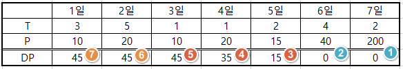 상담일자를 {1, 4, 5}를 하거나 {3, 4, 5}를 선택했을 때 cost = 45라는 최대 이익을 낼 수 있습니다.