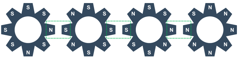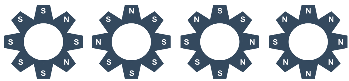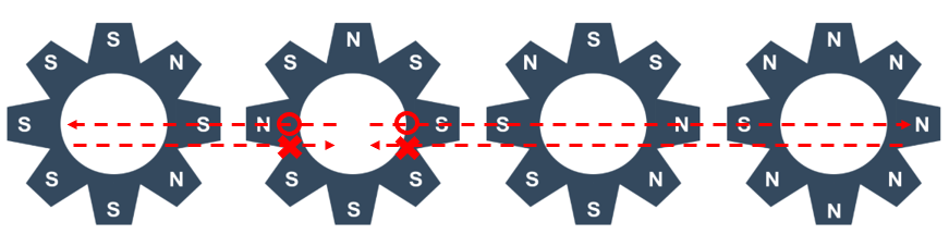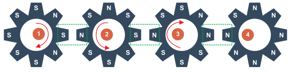 - 인접한 톱니바퀴의 맞닿은 극의 톱니는 2번째 6번째 요소입니다.