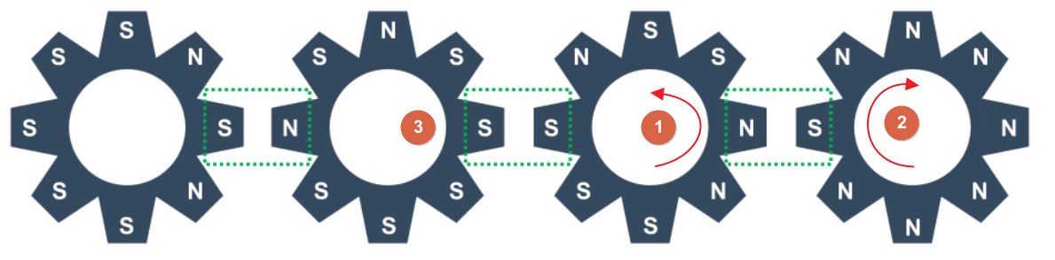 [2]번 바퀴는 S-N 규칙으로 인해 반시계 방향으로 회전한다.