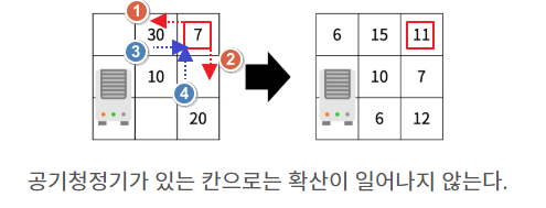 (공기청정기가 있는 칸으로 확산되거나 배열을 벗어나지 않는다.)