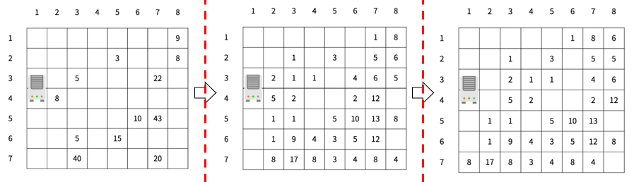 2. 미세먼지가 존재하는 칸에는 아래와 같이 확산.