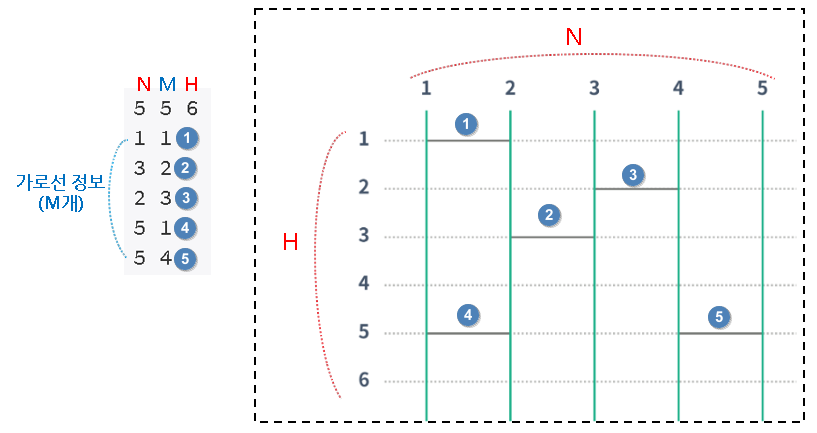 점선 구간에 놓여져 있는 M개의 가로선 정보가 주어집니다.