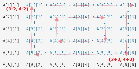 기준점을 좌측 상단 『1』을 기점으로 {테두리 길이 - 1} 만큼 순회합니다.