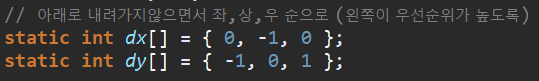 // 아래로 내려가지않으면서 좌,상,우 순으로 (왼쪽이 우선순위가 높도록)