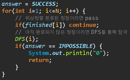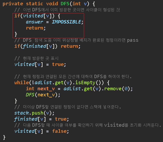 // DFS 탐색 도중 이미 위상정렬 배치가 완료된 정점이라면 pass