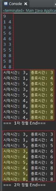 끝나는 시간이 같다면 시작시간이 빠른 순으로 정렬