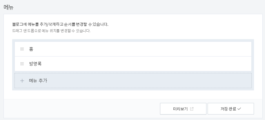 개인적으로 "방명록" 항목은 문의 사항을 남길 수 있도록 남겨두었다.