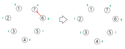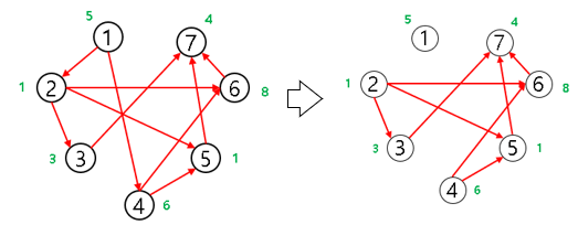 ▶ 진입차수가 0인 정점 ⑥와 연결된 간선 처리