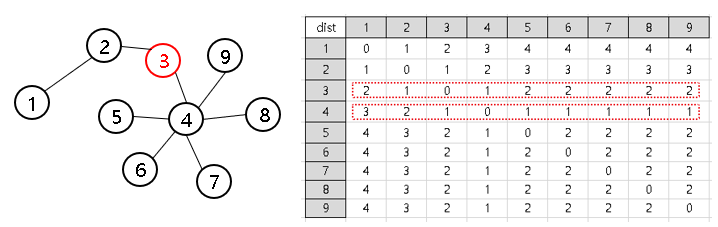 ② dist[][] 테이블에서 위원회의 개수와 연결된 참가자(정점)을 구합니다.