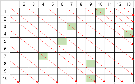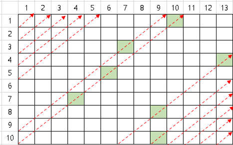 ex) (7, 6) ↔ (8, 5) ↔ (6, 7) ▷ x + y = 13