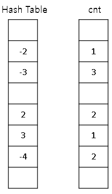 - A[i] + B[j] 결과 값을 저장하는 Hash Table과 해당 결과가 몇 번 나왔는지 저장하는 cnt[] 배열 이용