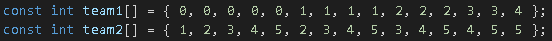 const int team1[] = { 0, 0, 0, 0, 0, 1, 1, 1, 1, 2, 2, 2, 3, 3, 4 };