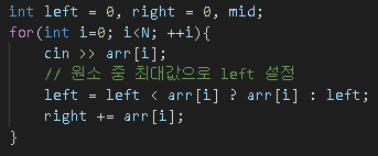 최소(left) = 원소 중 최대값, 최대(right) = 모든 구슬의 합에서 이분탐색 과정으로 찾아갑니다.