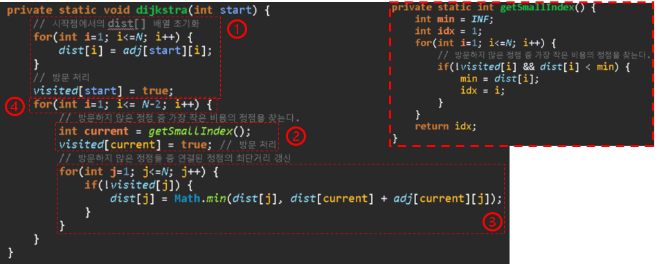 ① 출발 정점을 기준 dist[] 초기화 + 출발 정점 방문 표시