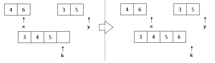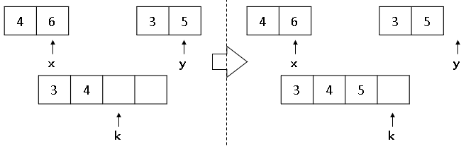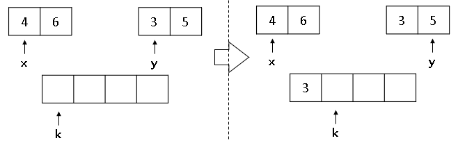 ① x, y 비교 ▶ 4 < 3 이므로 k 위치에 3을 넣습니다. (y++, k++)