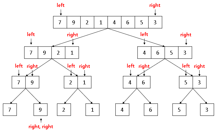 재귀함수르 통해 크기가 = 1 (left >= right)될 때까지 분할 합니다.