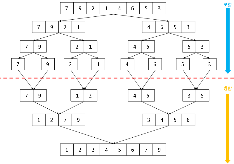 병합 정렬은 분할 정복(divide and conquer) 기법으로 만들어진 정렬 방법