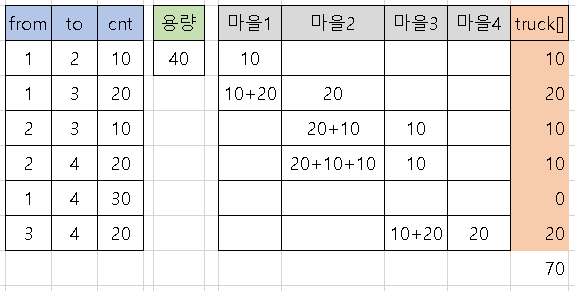 트럭에 싣기만 하면 배달이 된 것이므로 10 + 20 + 10 + 10 + 20 = 70