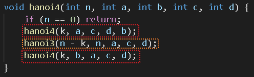 hanoi4(k, a, c, d, b); // k개 원판을 여분의 기둥 b에 옮기고