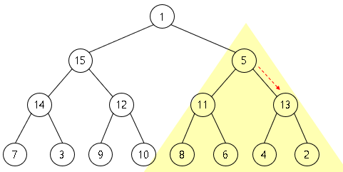 부모 노드 5 < 자식 노드 11, 13 이므로