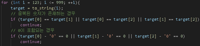 따라서 123~999까지 숫자 0을 포함하거나 동일한 숫자가 나오는 경우를 제외합니다.