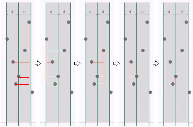 ④ 중간 부분에서도 마찬가지로 x 좌표상 거리가 『d』 이하인 점들끼리만 실제 거리를 비교합니다.